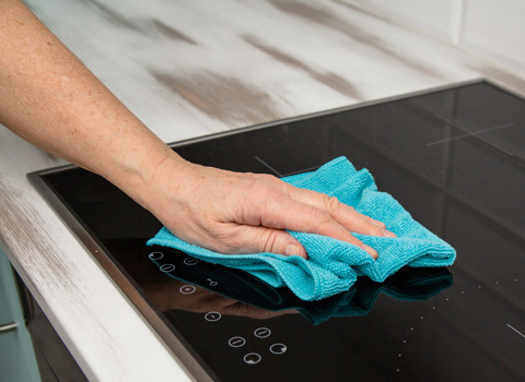 Leichte Verschmutzungen können mit einem feinen Tuch und Abwaschmittel entfernt werden. Bei starker Verschmutzung Glaskeramikreinigungsmittel auf einen Schwamm auftragen, einwirken lassen und mit einem Tuch entfernen. Eingebrannte Verschmutzungen können auf Glaskeramik-Kochfeldern mit einem Rasierklingenschaber entfernt werden.